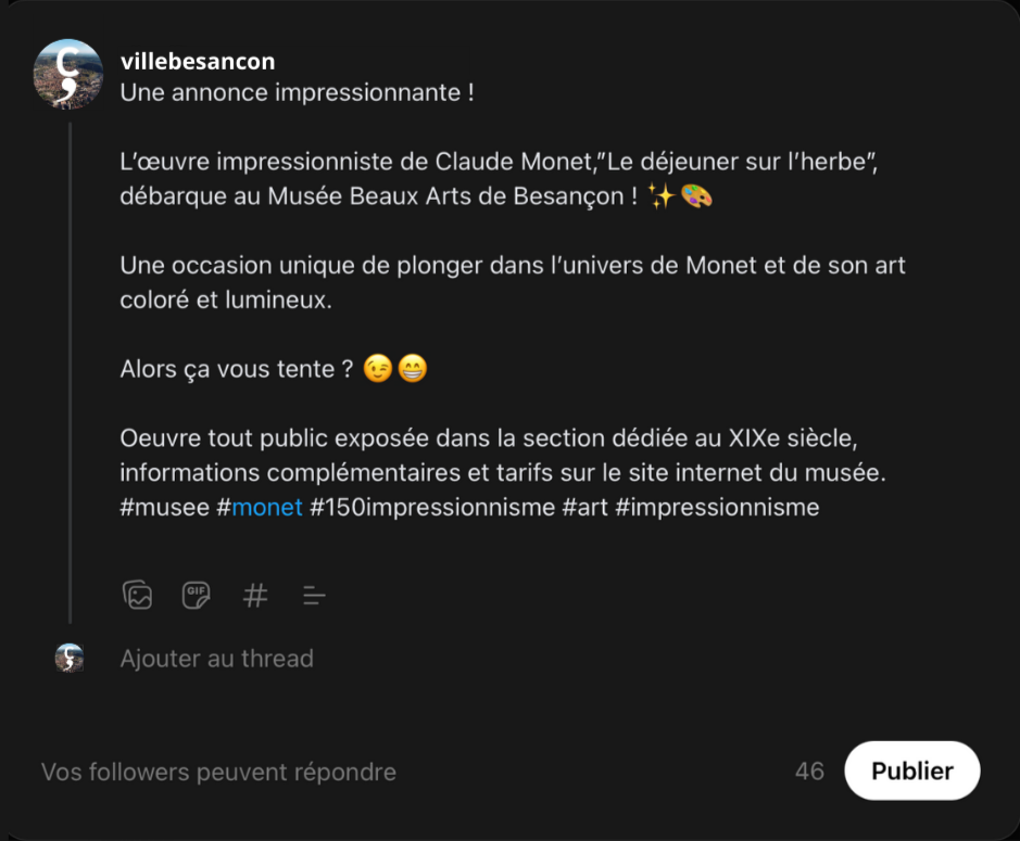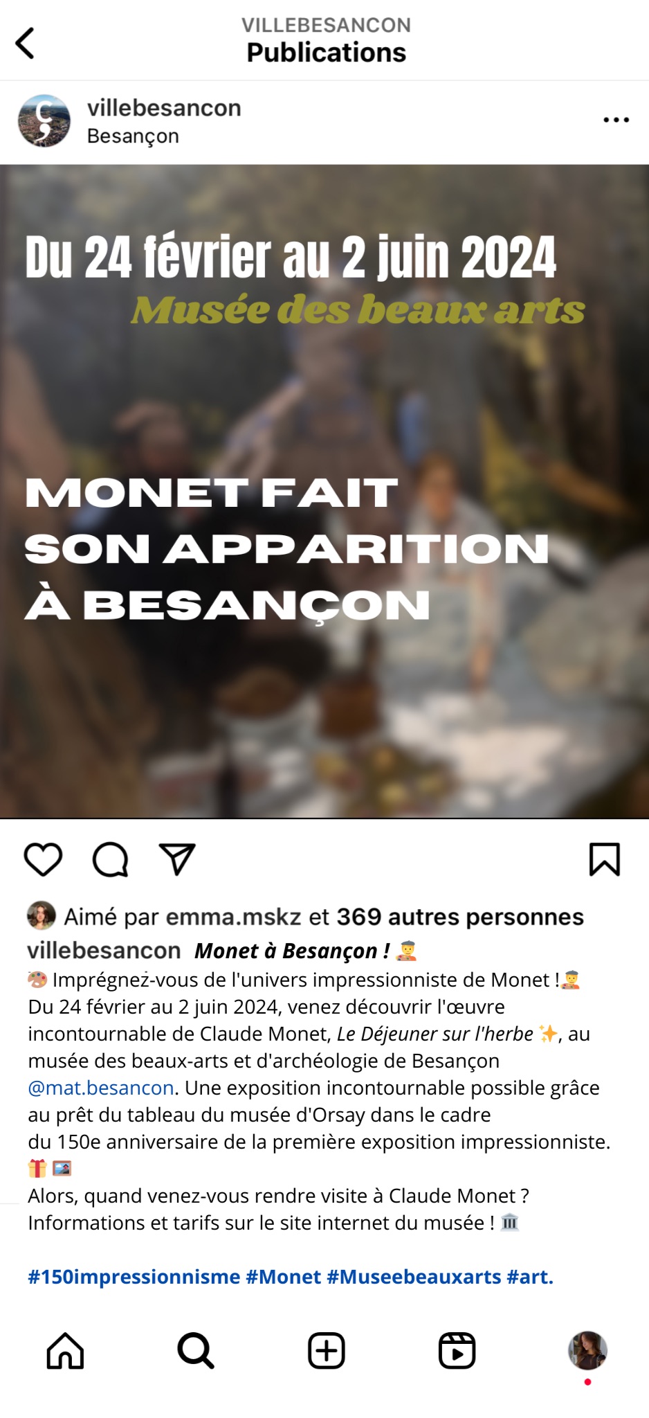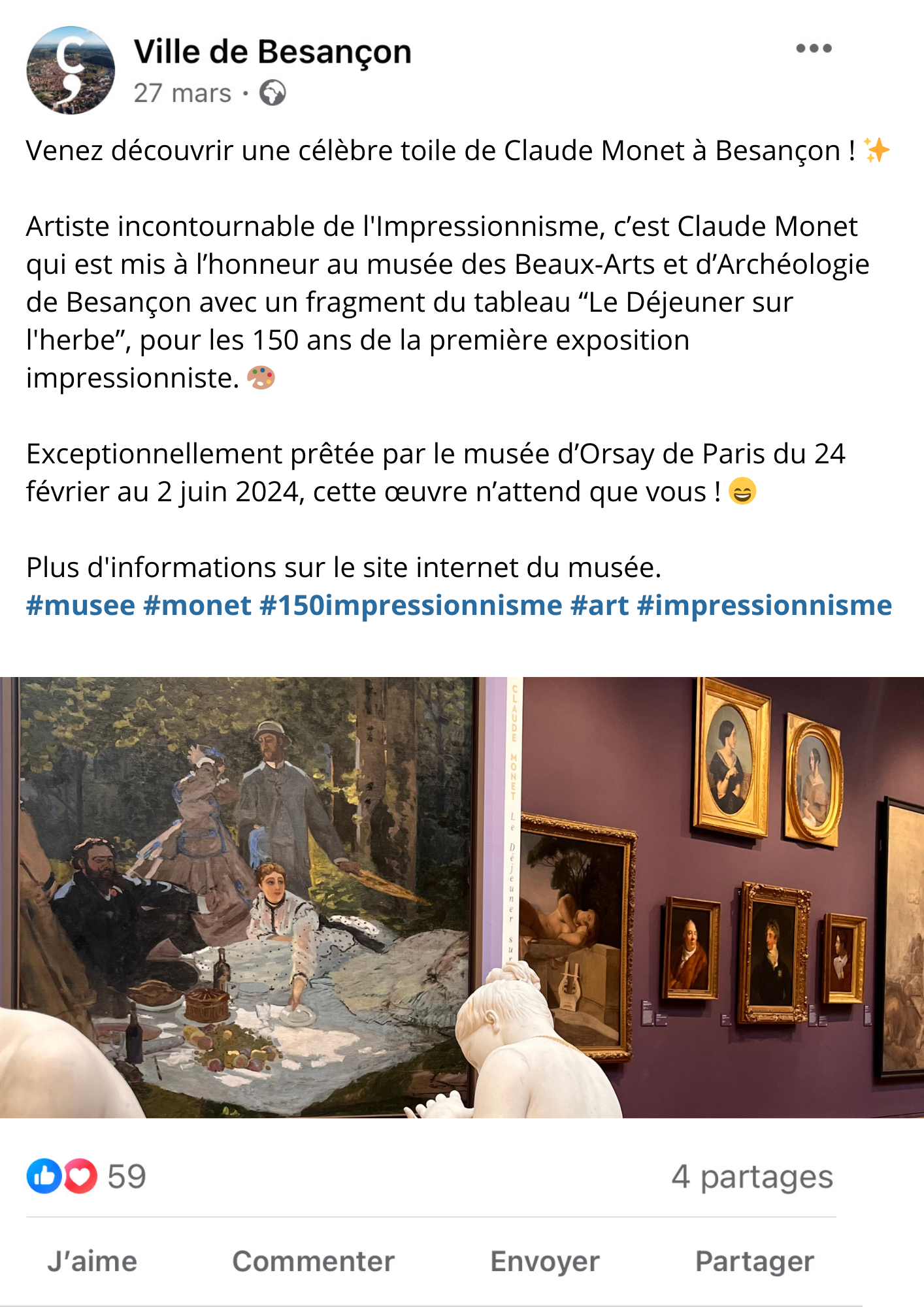 Dans le cadre de l’exposition Monet à Besançon en 2024, par équipe nous avons crée du contenu pour les réseaux sociaux de la ville de Besançon. Voici, les posts avec leur description.