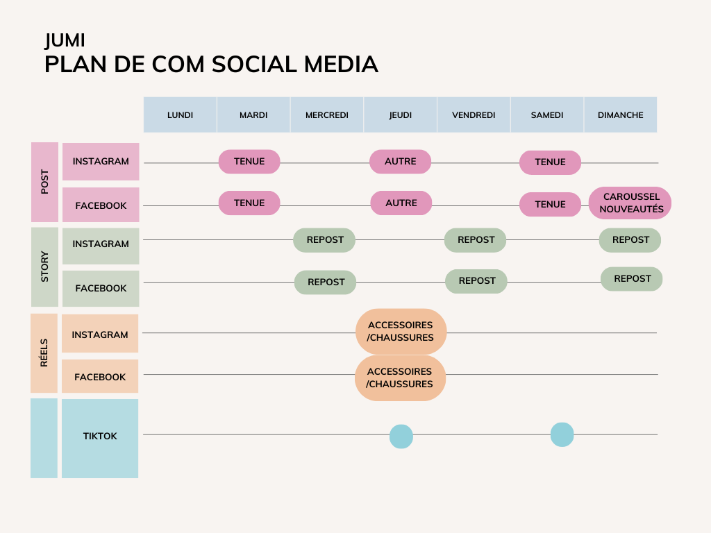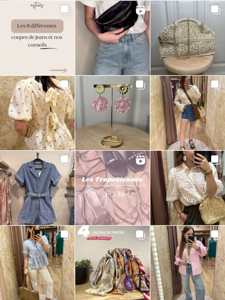 Durant le cours de social média, il nous était demandé de créer un feed insta composé de 9 posts pour la marque de notre choix ayant moins de 10k. Le but étant de proposer un contenu varié, dans la DA de la marque et avec des posts formant une jolie harmonie visuelle. Nous avons donc choisi la marque JUMI, boutique de prêt-à-porter.