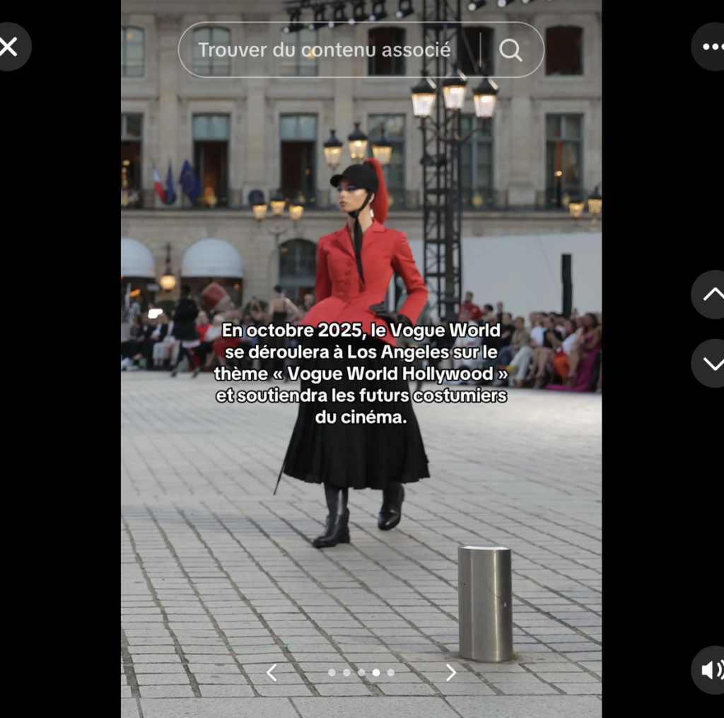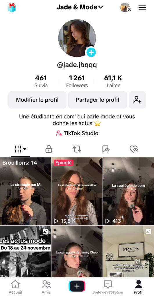 Ce compte TikTok est un défi que je me suis lancée à moi-même. C’est une vidéo par jour qui sort sur la plateforme, un jour sur deux c’est un vidéo face caméra que j’ai écrite, tourné, monté et ajouter sur TikTok et les autres vidéos sont consacrés au infos de dernières minutes comme les actualités de la semaine dans le domaine ou les photos d’un défilé… C’est un rythme conséquent, en sachant qu’à côté de ça j’ai mon alternance, les cours et ma vie personnelle.