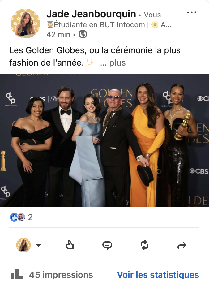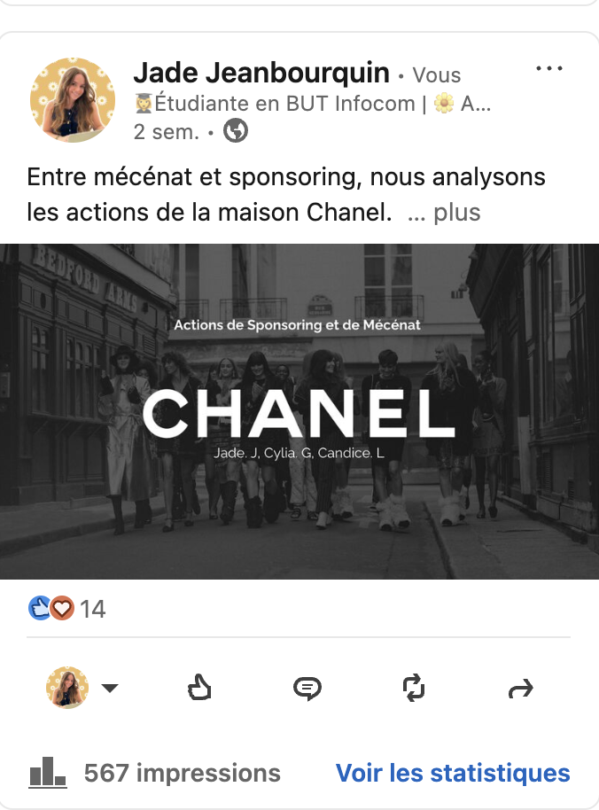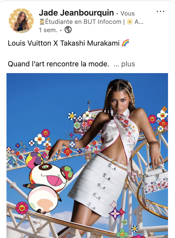 Il est essentiel d’être actif sur LinkedIn. Je le suis depuis le début de mon cursus post-bac, mais encore plus intensément cette année. Au-delà de parler de mes projets scolaires ou de mon alternance, il m’a semblé important de partager également mon activité en lien avec la mode.